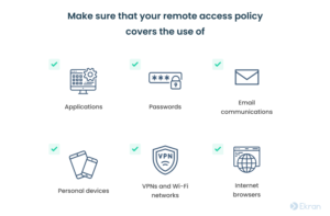 Il telelavoro moltiplica i rischi derivanti dai nuovi arrivati. Gli ambienti di lavoro remoti espandono la superficie di attacco. L’articolo di Gartner sulle sette principali tendenze della sicurezza informatica afferma che il 60% dei lavoratori è in remoto e almeno il 18% non tornerà in ufficio a partire dal 2022. Potresti voler fornire ai telelavoratori ulteriore aiuto e guida per proteggere l’ambiente di lavoro remoto. Considera la standardizzazione e descrizione degli standard di sicurezza per il lavoro remoto in una politica di accesso remoto. Definisci tutte le procedure di sicurezza per l’accesso ai dati aziendali tramite reti remote, VPN e altri mezzi. Fornisci un elenco di cosa dovrebbero fare per proteggere l’ambiente di lavoro remoto. Assicurati di coprire l’uso di:
